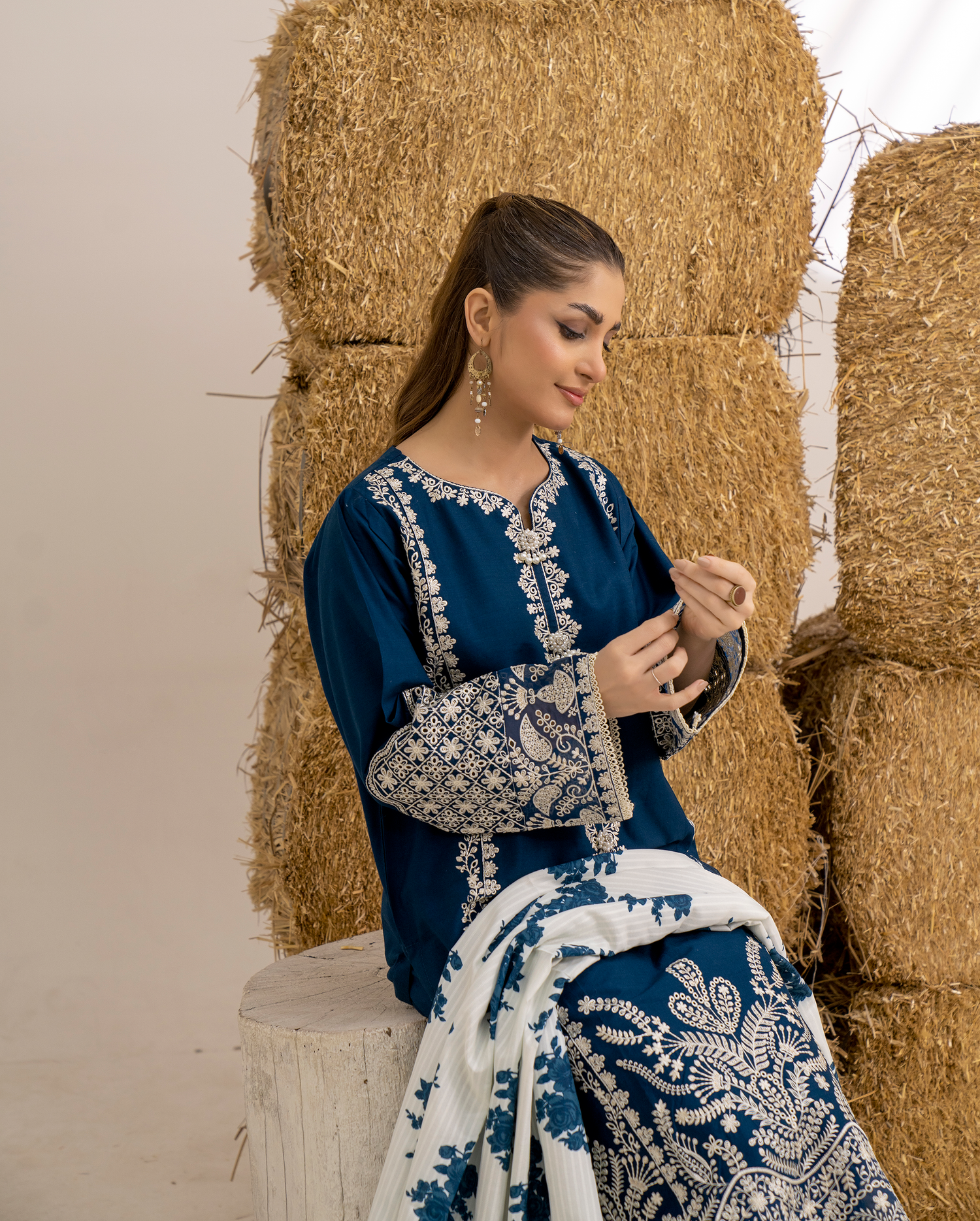 Navy Blue Embroidered 3-Piece Unstitched Lawn Suit with Printed Dupatta